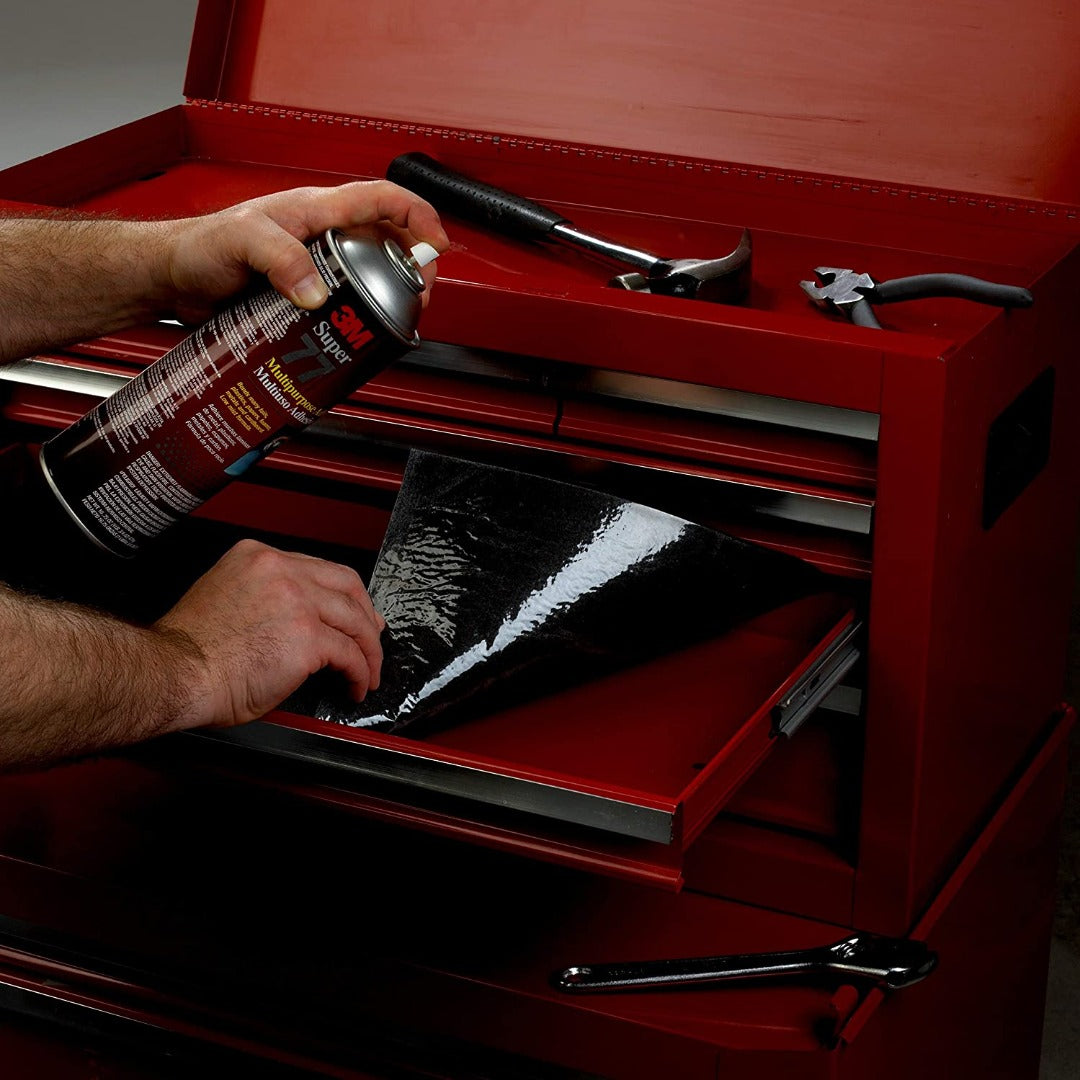 3M™ Super 77™ Multipurpose Spray Adhesive is a fast drying adhesive that bonds quickly within 15 seconds. The spray is versatile and acts to securely bond many lightweight materials. It offers high coverage and low soak in for long lasting bond. The spray is great for permanently attaching foils, carpeting, lightweight foams, paper, cardboard, felt, and cloth to painted or unpainted metals, wood, and hardboard.