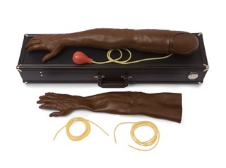 Lifelike adult male arm reproduction in brown skin tone with infusible arteries designed for training the proper arterial puncture procedure for blood gas analysis. Arm has injectable deltoid pad and fits adult male manikins.