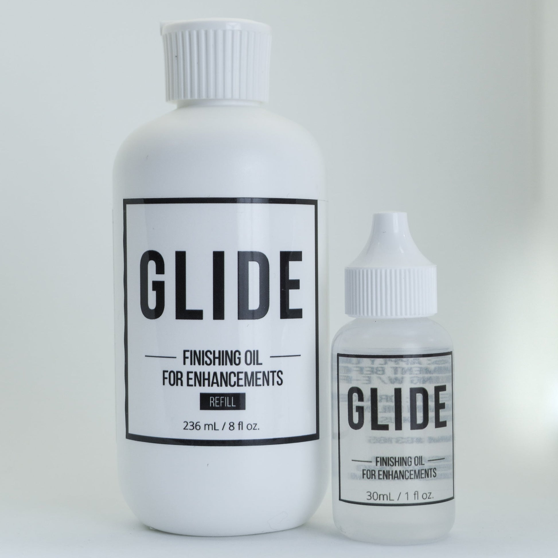 Glide finishing oil for enhancements. Watch IGTV demo here! Directions: Apply oil to enhancement before finish filing w/ electric file.