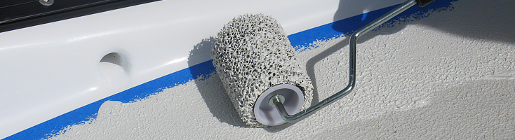 KiwiGrip is a revolutionary, durable, non-skid coating that spreads quickly and easily with our proprietary roller, offering a beautiful, high traction surface. By varying the application technique, the texture can be adjusted from a rolled pleasure boat texture to an industrial aggressive work boat texture. As a homogeneous material, KiwiGrip doesn't suffer from the problems encountered with products filled with sand, walnut shells, beads, rubber fleck, or other fillers. Coatings with fillers tend to wear through, and the fillers fall out leaving an unsafe deck that's hard to clean and even harder to re-coat.