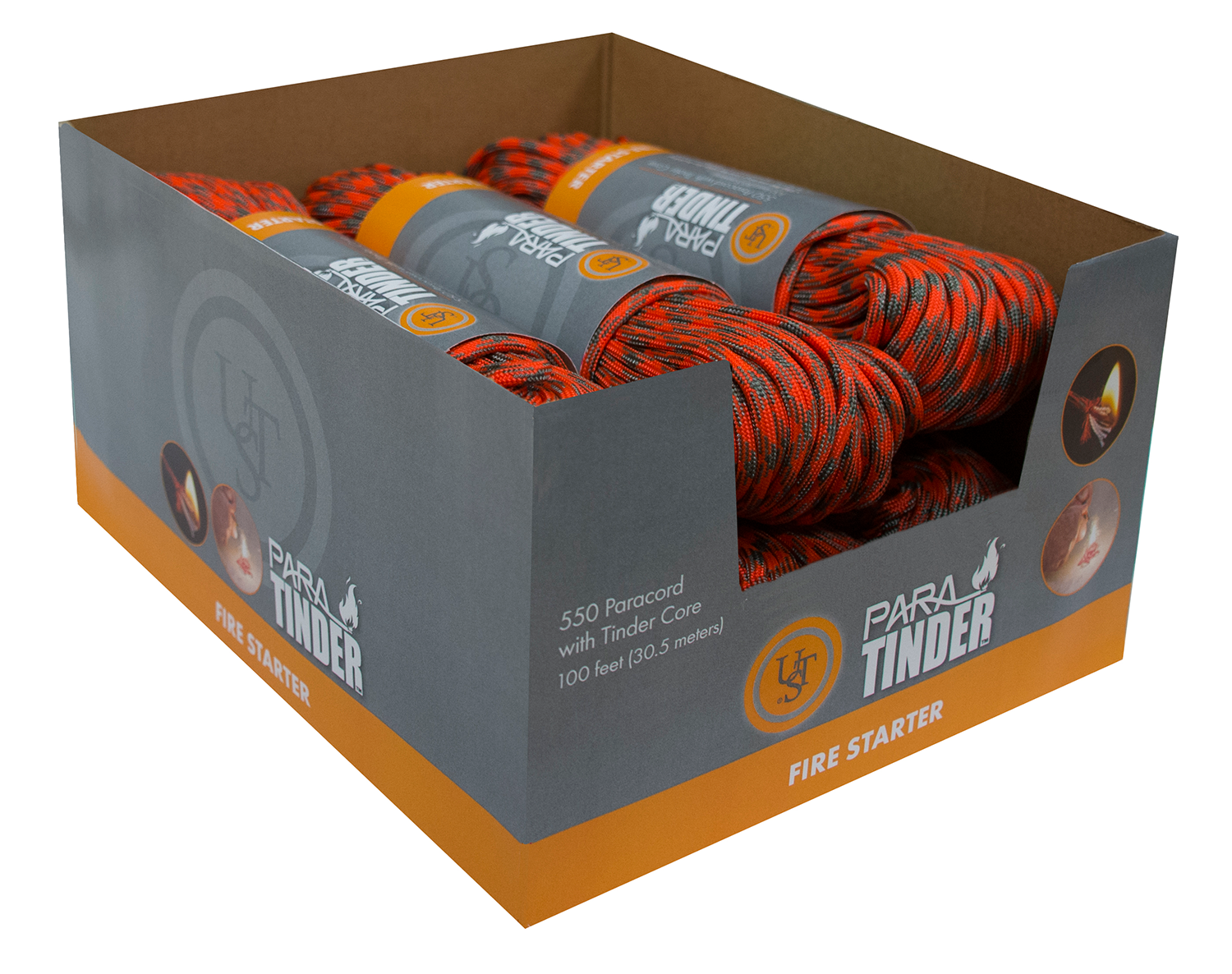 | • To ignite, expose red core thread and light with any fire starter such as the UST BlastMatch™ or UST StrikeForce™ • Create bracelets, zipper pulls, handle wraps, and lanyards for emergency situations • Core threads can be used as sewing thread, sutures, fishing line, and more • 100 ft of paracord fire tinder |