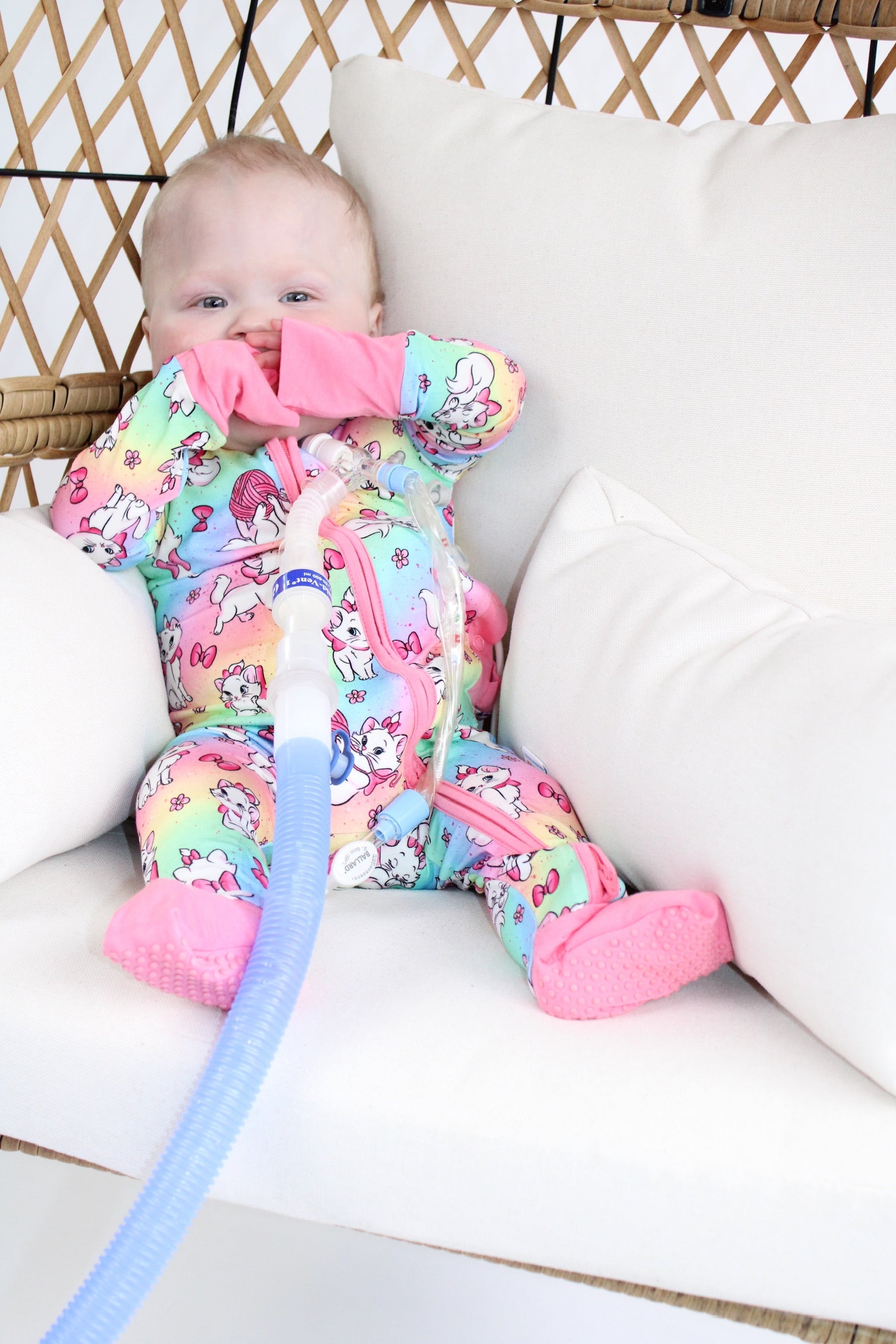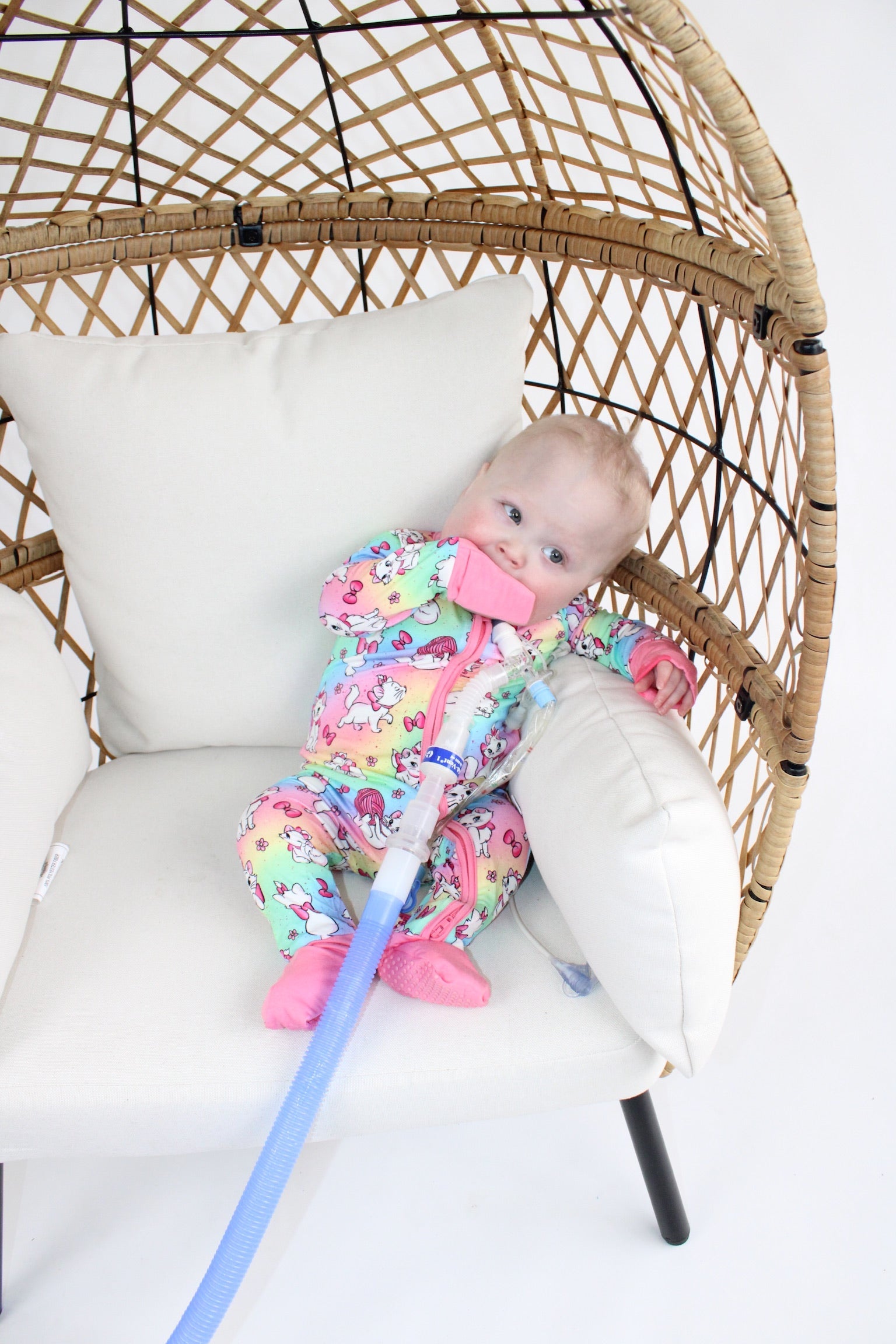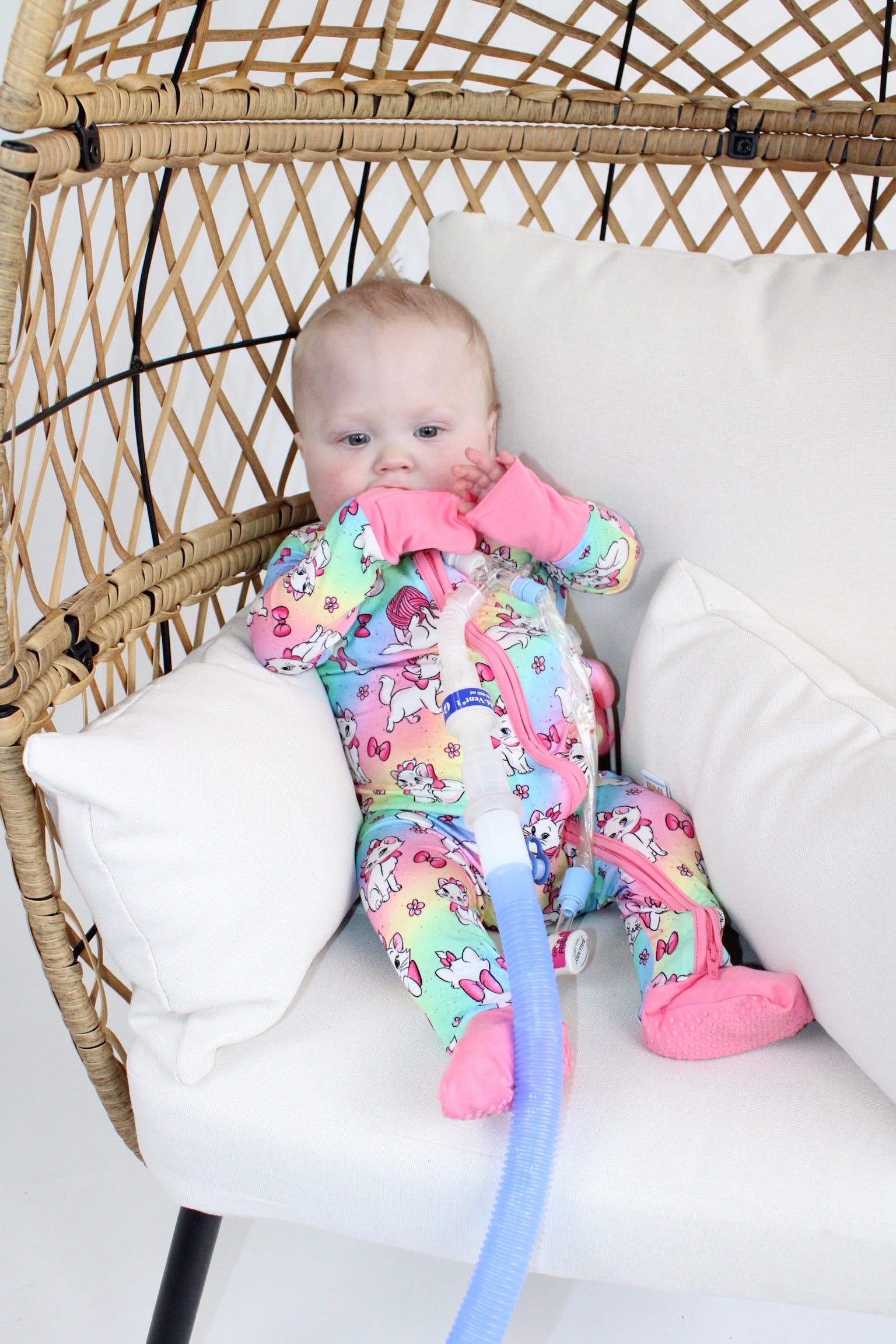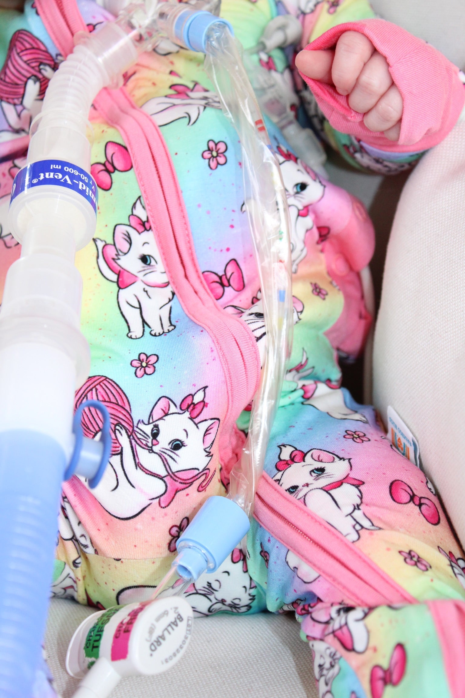 - Button port access on side of zipper romper for tubes to be easily accessible
