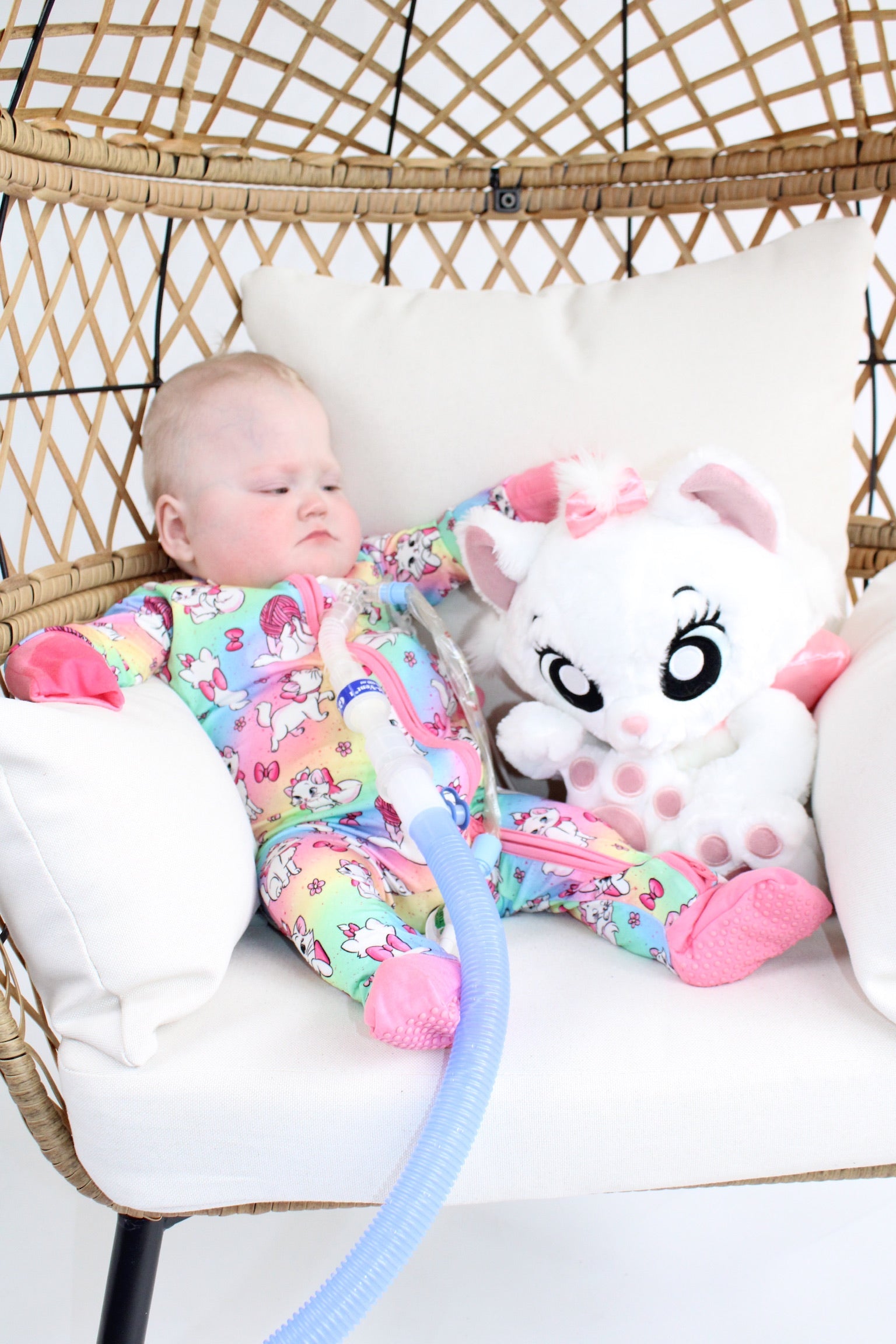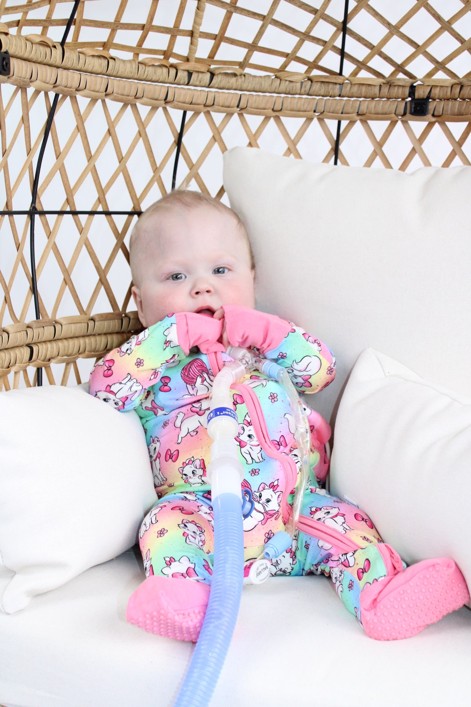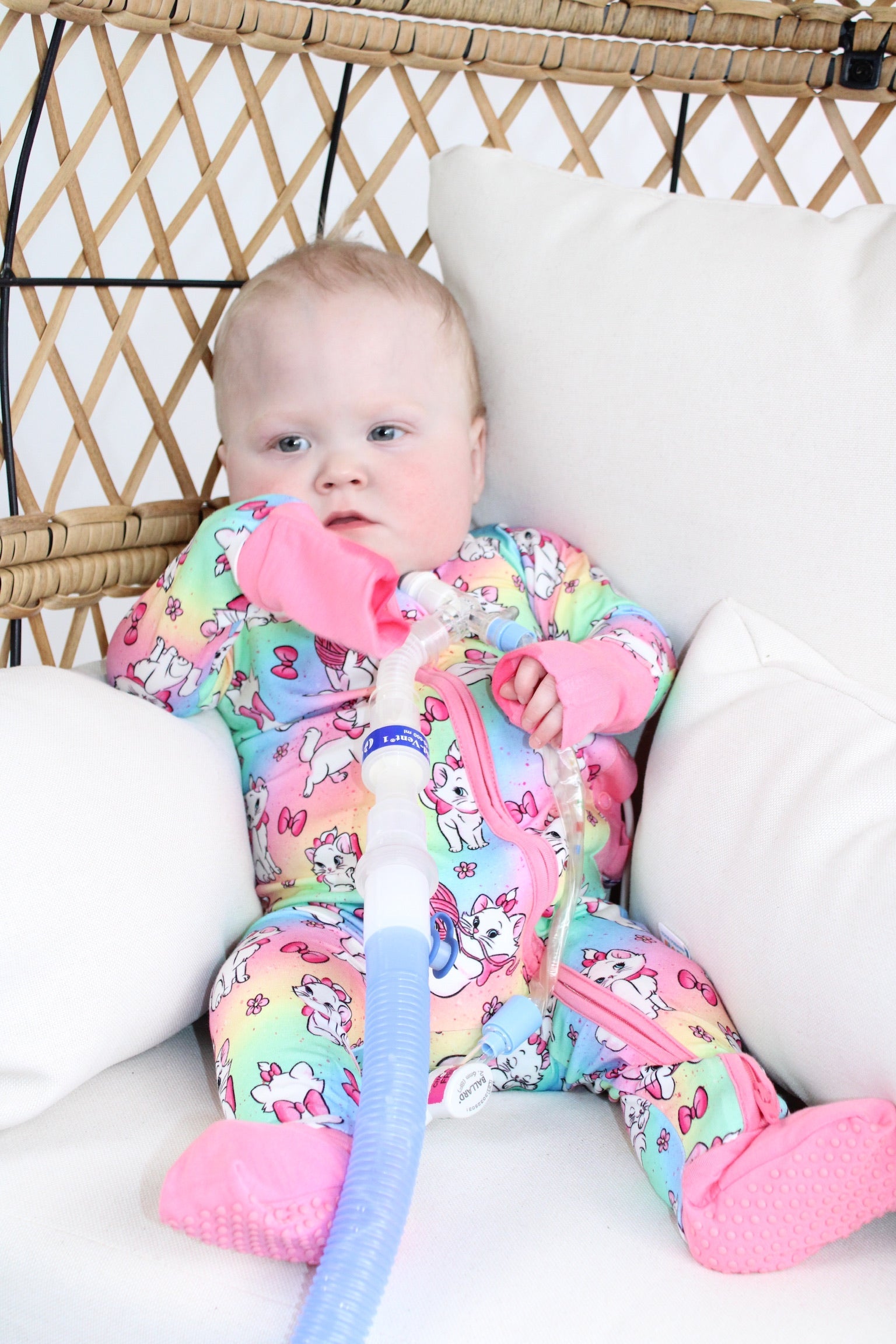 - Button port access on side of zipper romper for tubes to be easily accessible