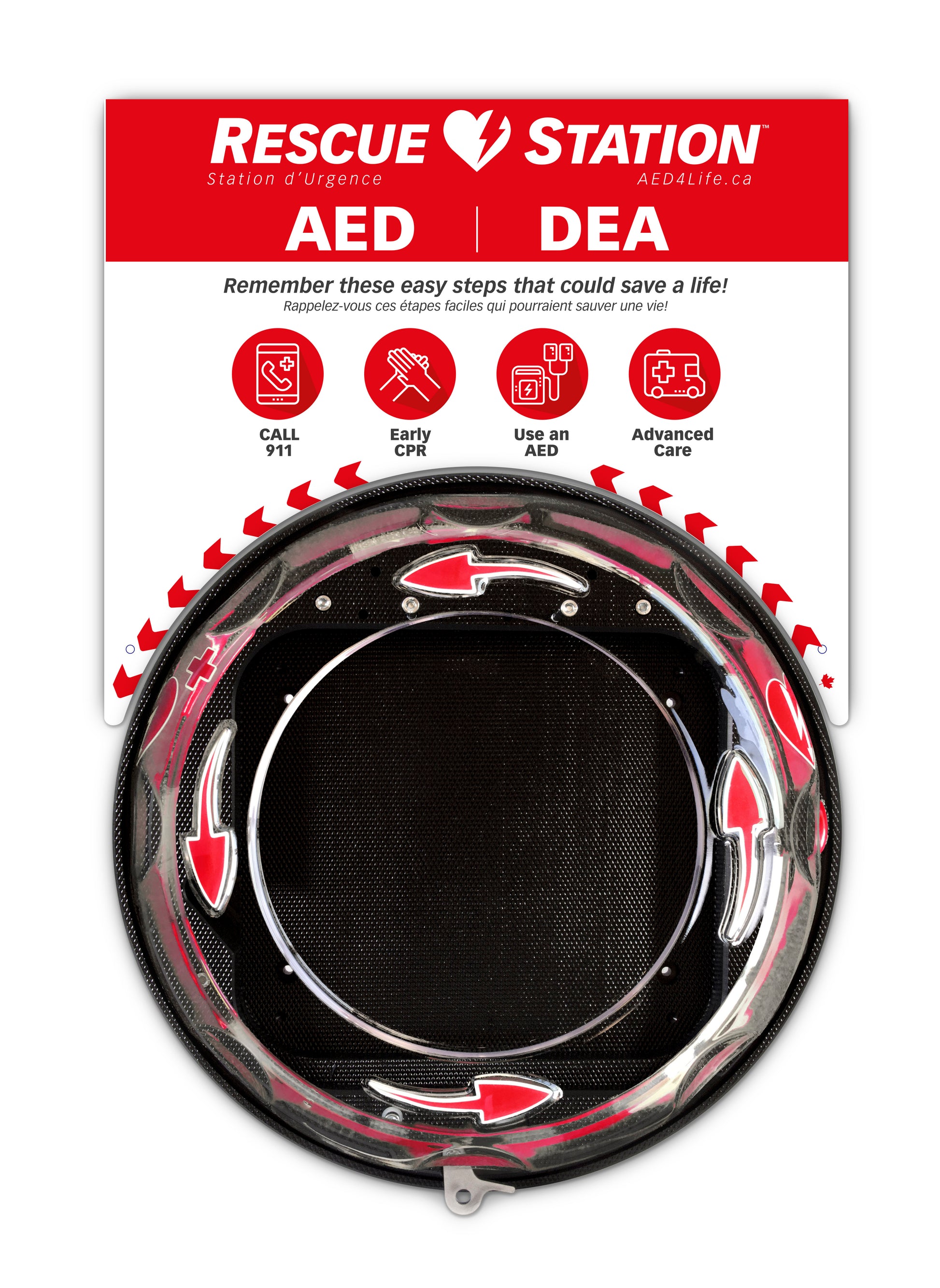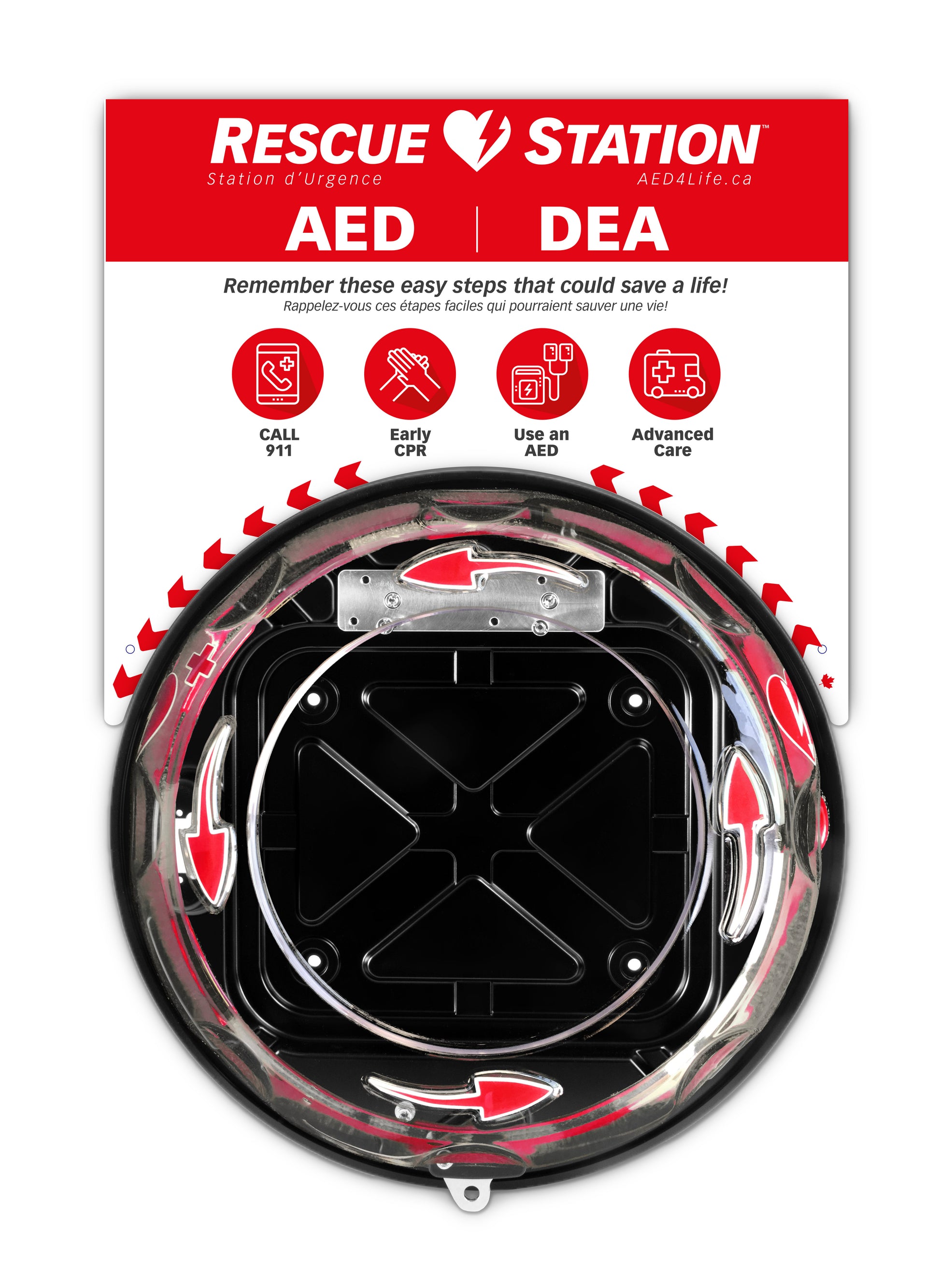 For use with Rotaid cabinet alone (not included) or RescueStation Totem (not included). Gives greater visibility to the defibrilator. Step by step direction for Cardiac Emergencies.