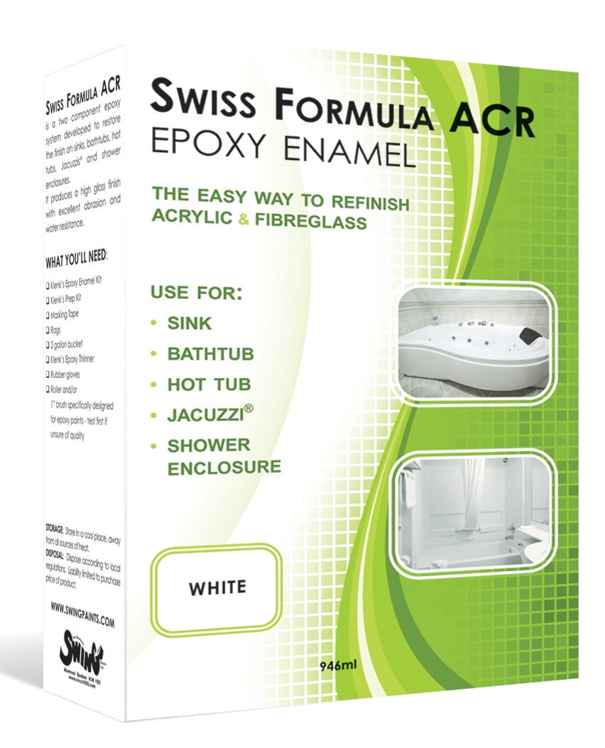 Swiss Formula ACR is an extremely hard and durable two-component epoxy for consumer and professional use. It is specially designed to restore the finish on acrylic and fibreglass tubs,sinks, hot tubs, spas and jacuzzis. Swiss Formula ACR is available in White, as well as special order colours.